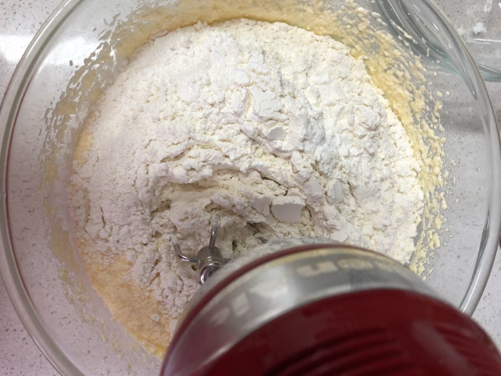 - Add in the sifted flour, mix in low speed, make sure there’s no lumps 加入以過篩的麵粉, 低速打至沒有粉粒