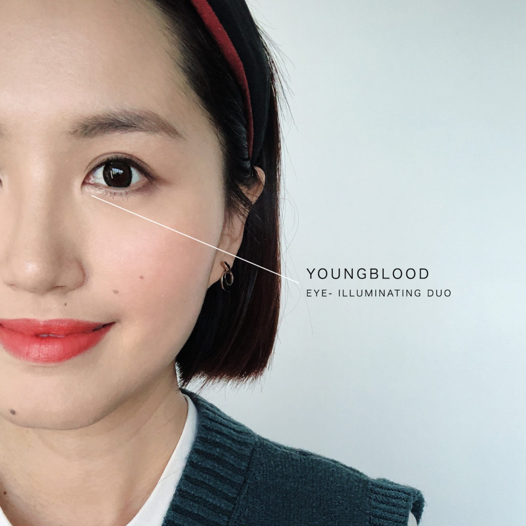 1)用 YOUNGBLOOD 珠光筆在眼頭的下方畫上1/3長度的眼缐,如果眼週容易出油,可以用珠光粉加在眼缐上有定妝的作用,如果以「微」閃粉效果也不錯( 粗閃粉效果會太誇張所以不適合)。